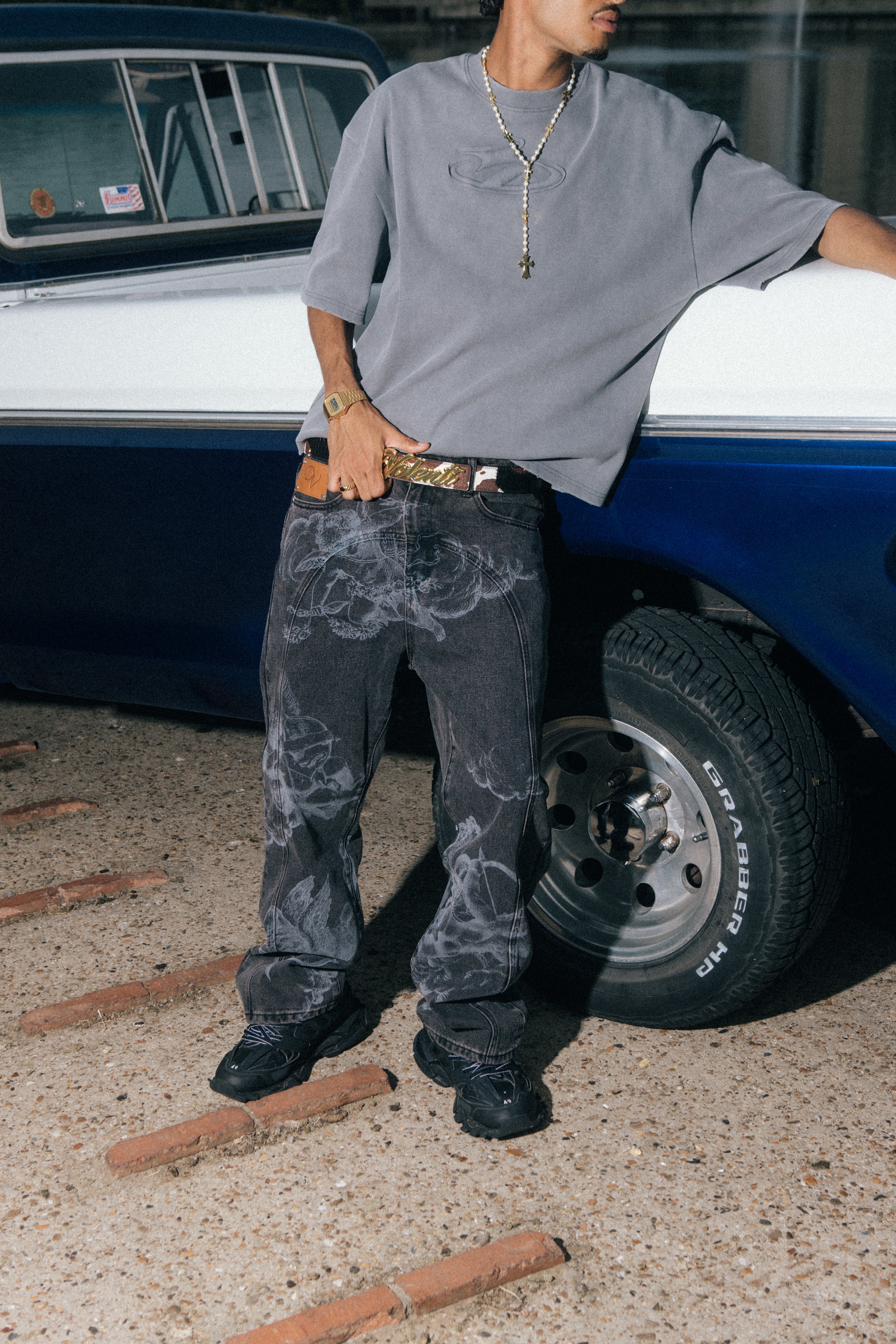 These jeans feature a relaxed, baggy straight fit in a washed black finish, enhanced with metal stud detailing.