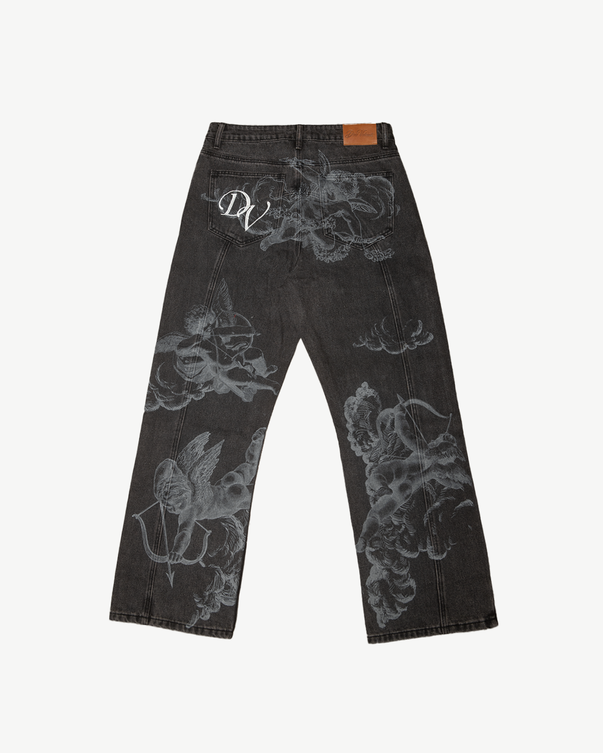 Embroidered DV logo on the pockets, with embossed leather accents and an all-over Cupid print.