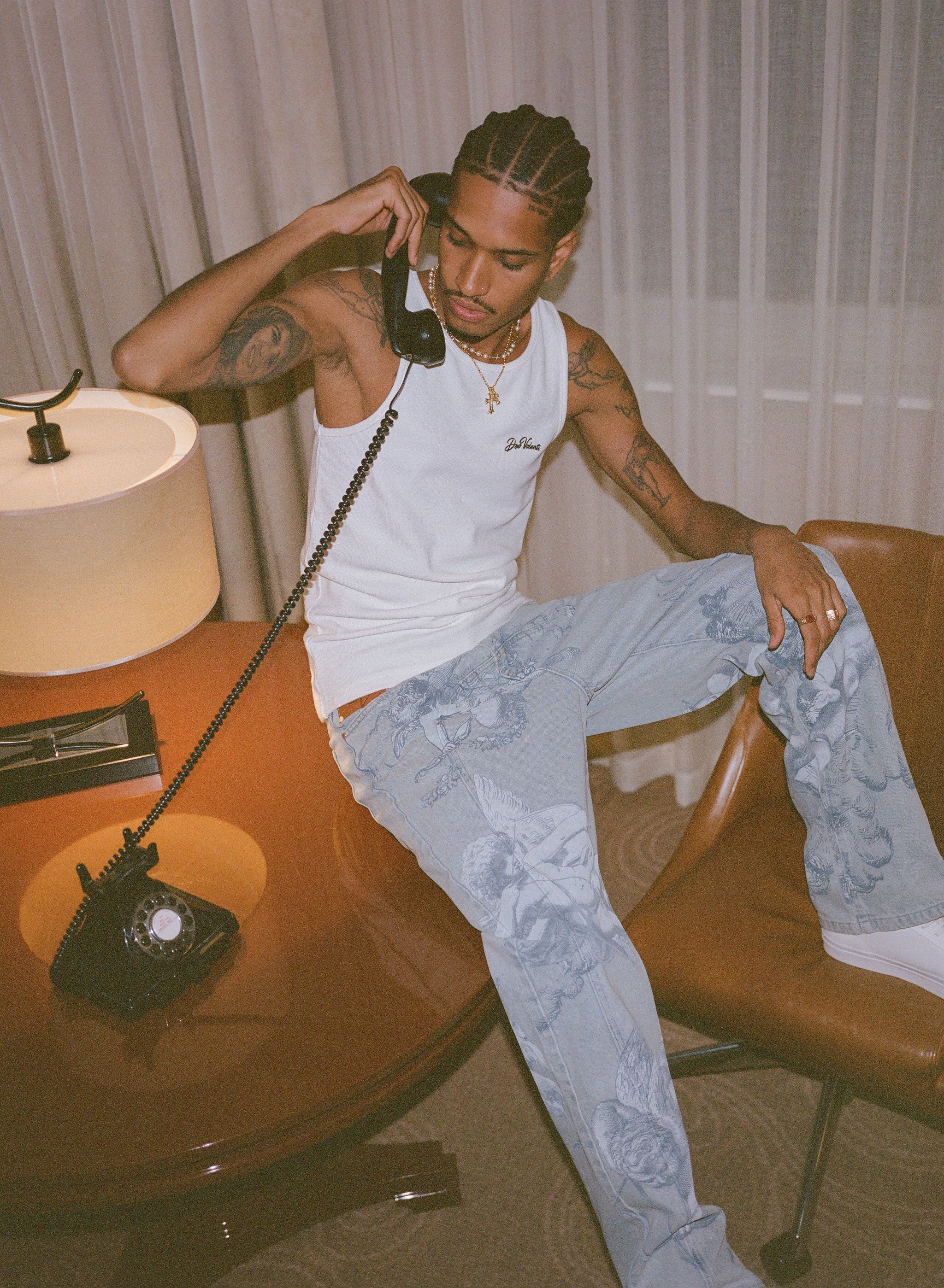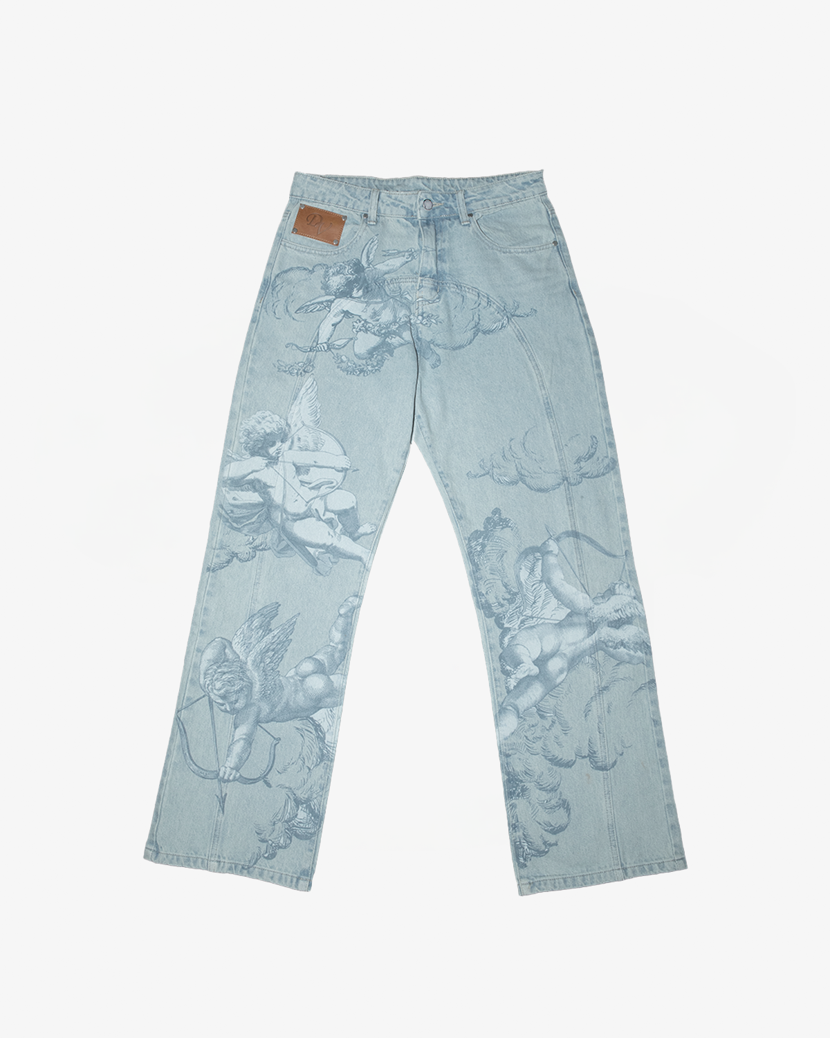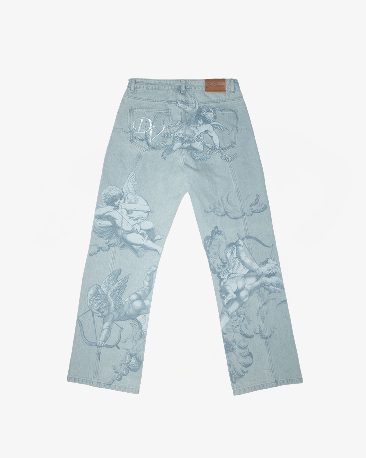 Embroidered DV logo on the pockets, with embossed leather accents and an all-over Cupid print.