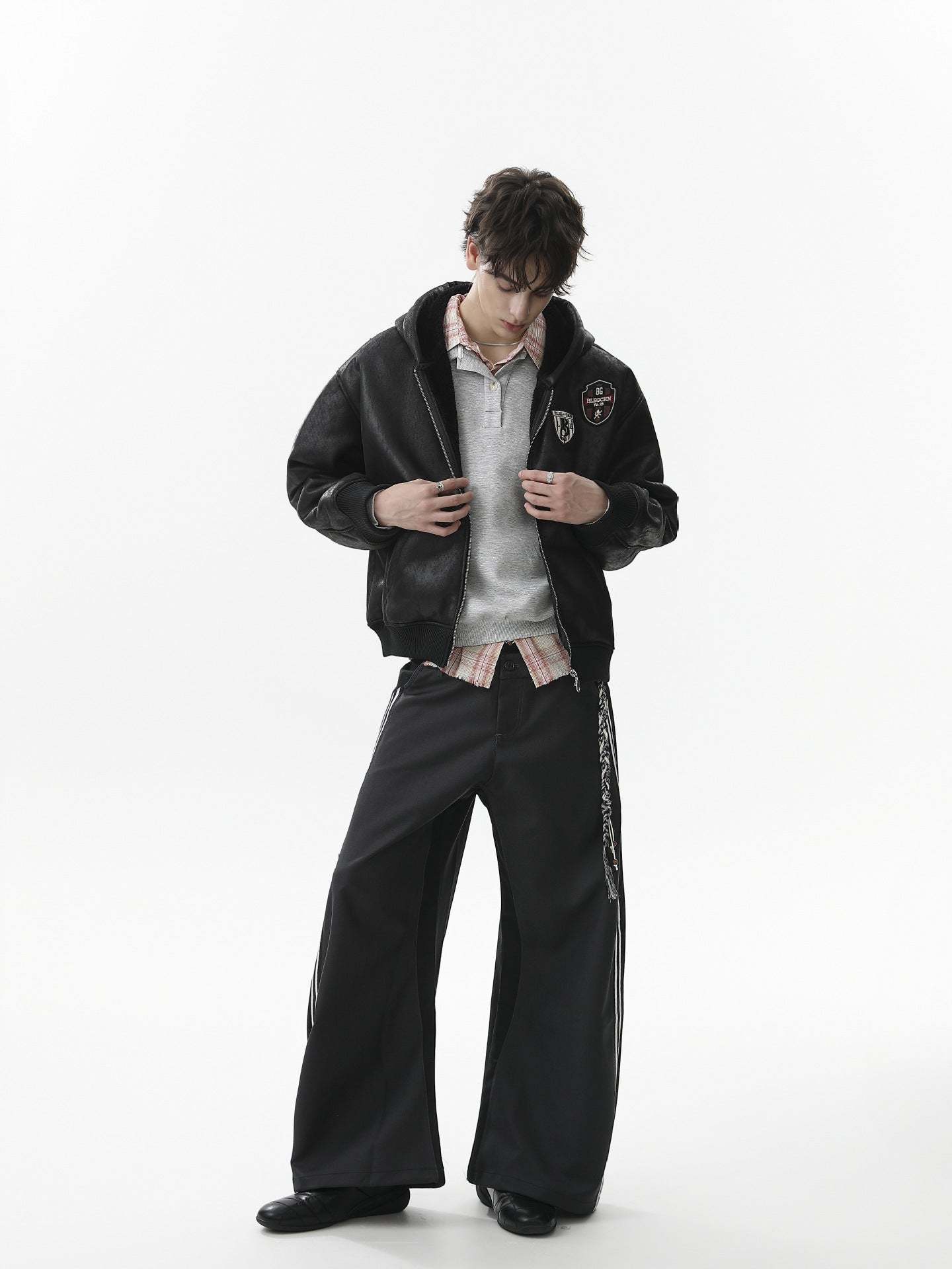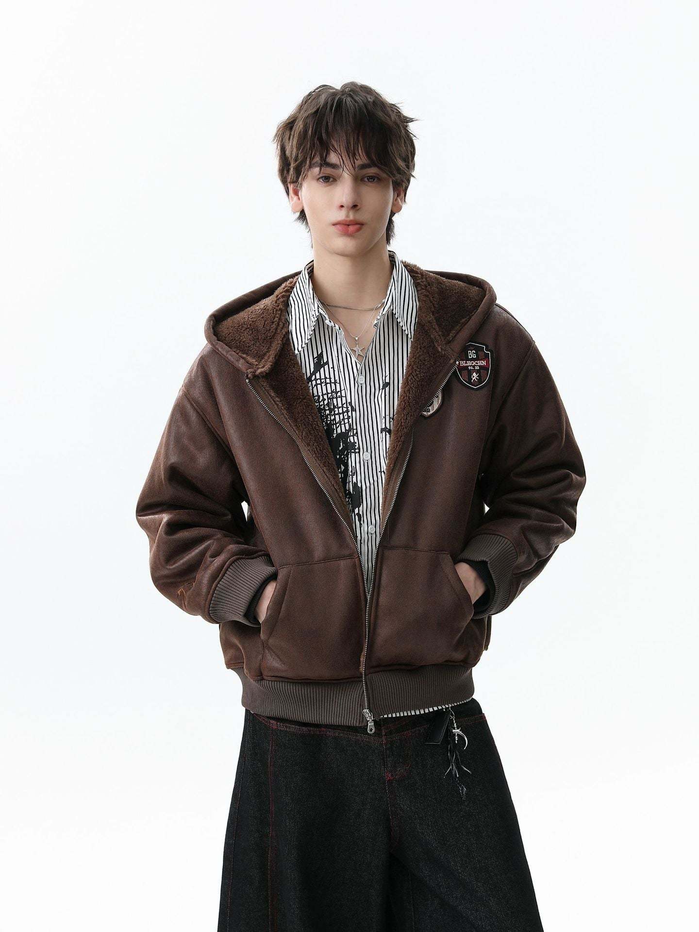Vintage Leather Badge Fleece-lined Hooded Zip Bomber Jacket - 2547
