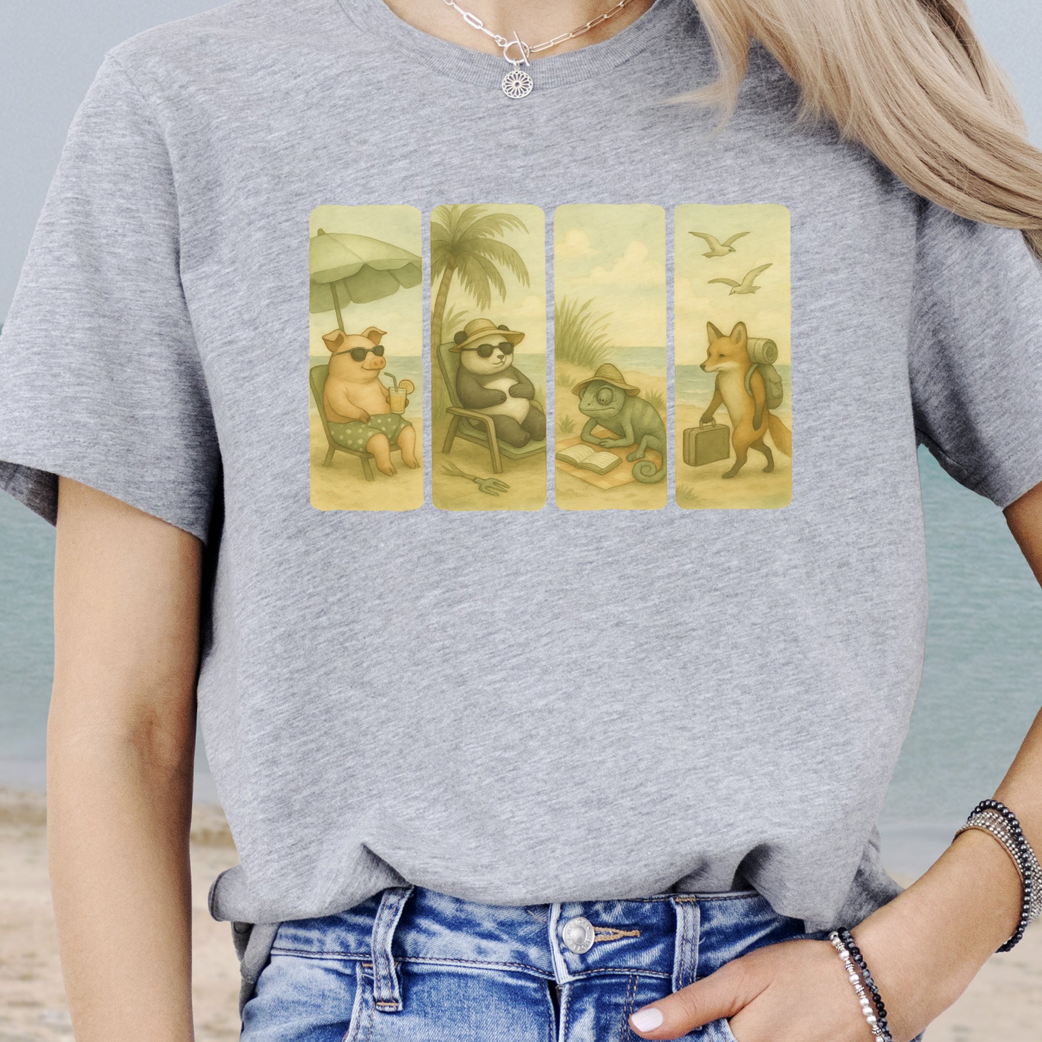 Beach Animal Strips T-Shirt – Cute Panda, Fox, Pig & Chameleon Vacation Tee