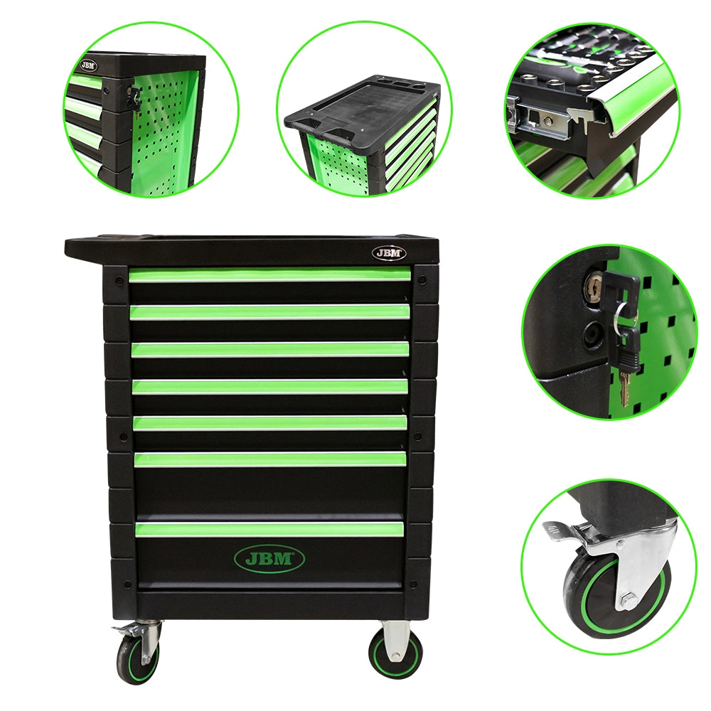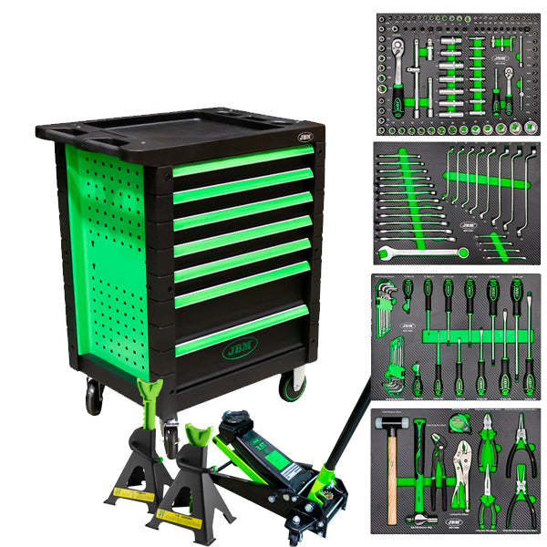 Carro de herramientas JBM equipado con 173 herramientas de calidad profesional JBM con Gato hidráulico de 3,5T y juego de caballetes de 3T.