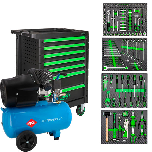 Carro de herramientas completo con 175 herramientas de calidad profesional JBM equipado junto con compresor de alta calidad, 50L, 3CV y 8Bar.