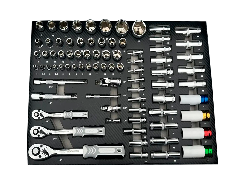 - 1er cajón: juego de 3 carracas (Grande, mediana y pequeña) con vasos cortos y vasos largos, extensiones y juntas universales + 4 vasos de impacto con anilla de teflón para rueda.