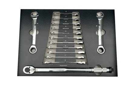 - 3er cajón: surtido de llaves planas de 8 a 22mm combinadas con carraca + llave dinamométrica 40/210nm