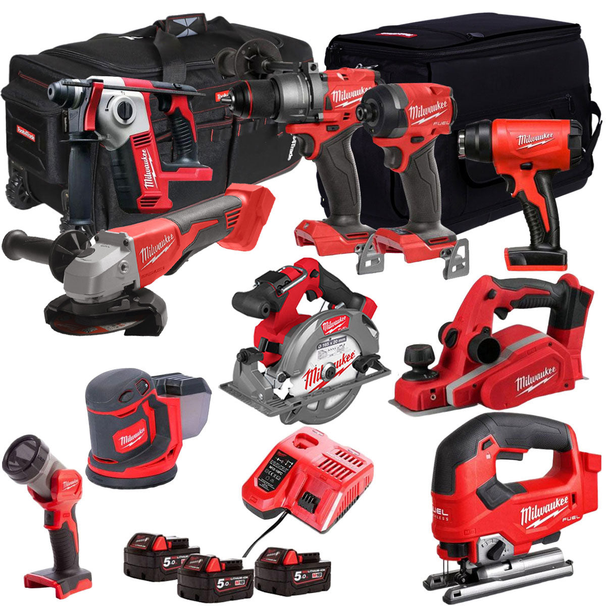 Milwaukee 18V Cordless 10 Piece Tool Kit with 3 x 5.0Ah Batteries & Charger in Bag T4TKIT-507