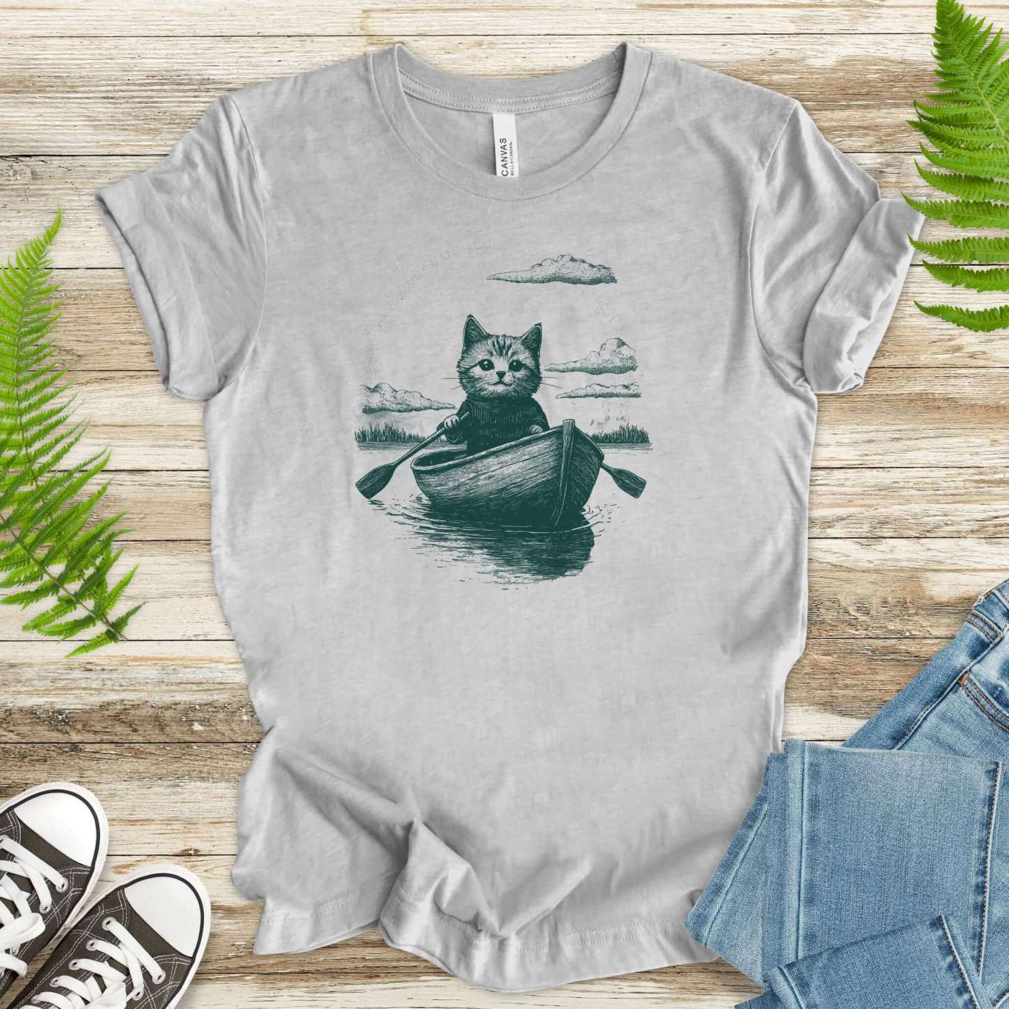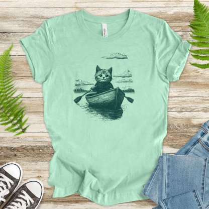 Drifting through unknown waters with unknowable thoughts—our Mysterious Rowboat Cat T-Shirt features a surreal black sketch of a lone cat in a tiny rowboat, floating across a still lake. Quiet, strange, and oddly poetic, this design is perfect for lovers of weird art, moody vibes, and cats who might just be on a secret mission.