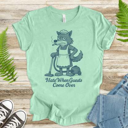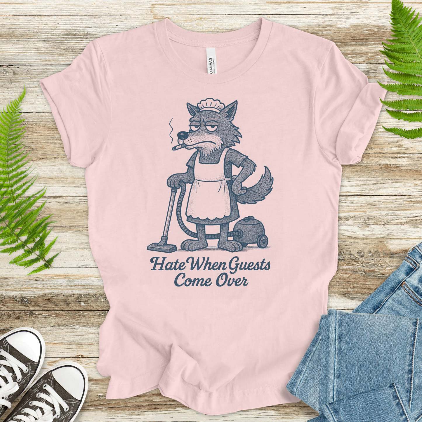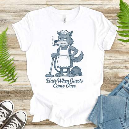 Tired of last-minute cleaning marathons? This grumpy wolf feels your pain. With a retro, hand-drawn style, it features a cigarette-smoking, vacuum-wielding wolf in a maid outfit—complete with the sarcastic slogan “Hate When Guests Come Over.” Perfect for introverts, anti-social spirits, and anyone who’s been caught in the pre-guest cleaning panic.